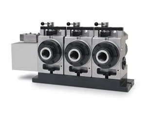 Triple-Spindle Servo 5C Heads with heavy-duty motor. Requires Haas mill with 4th-axis drive for full 4th-axis operation, or a rotary control box for stand-alone operation. This unit has no collet closing capability as standard.