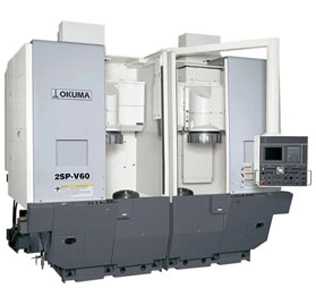 The 2SP-V60 twin spindle, four-axis, vertical lathes feature a rigid machine structure that delivers powerful, high accuracy cuts. The vertical box-shaped column is extremely rigid, allowing deep cuts at high RPM. Wide, square shaped saddle and cross slideways ensure high precision under all cutting conditions. This high performance VTL offers a precision machining solution for a variety of critical parts, including large diameter workpieces, such as brake drums and rotors, hubs and gears. One control operates two completely independent spindles, providing exceptional flexibility with resulting improvements in machining efficiency. This machine is available with live tooling on one or both sides, and with straddle tooling to machine disc brake rotors on both sides simultaneously.