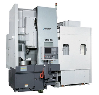 The VTM-65 three-axis vertical turning center combines the benefits of a vertical lathe with those of a machining center. The 50 taper 36-tool magazine enables this machine to offer both turning and milling operations on a single platform. It is the ideal machine for efficient low volume parts production, including valve bodies and work that requires heavy milling. The box way construction and wide, angular slideways on each axis provide high rigidity for accurate machining. A vertical axis counterbalance assures smooth, stable feed at all speeds. The headstock is fixed to the base, minimizing the influence of thermal changes and vibration on cutting accuracy. In addition, the VTM-65 is available with a wide range of standard accessories, including a spindle orientation function.
